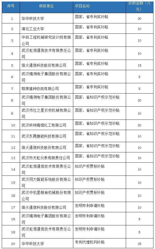 本次資金撥付對象為獲得洪山區(qū)2018年度洪山區(qū)知識產(chǎn)權(quán)項(xiàng)目資金的企業(yè),名單及資助金額見附件。